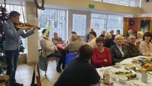 Wirtuoz Maciej w trakcie gry na skrzypcach.