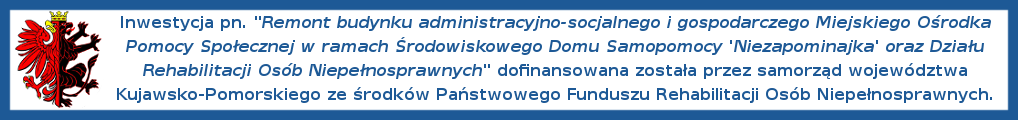 Inwestycja pn. „Remont budynku administracyjno-socjalnego i gospodarczego Miejskiego Ośrodka Pomocy Społecznej w ramach Środowiskowego Domu Samopomocy 'Niezapominajka’ oraz Działu Rehabilitacji Osób Niepełnosprawnych” dofinansowana została przez samorząd województwa Kujawsko-Pomorskiego ze środków Państwowego Funduszu Rehabilitacji Osób Niepełnosprawnych.